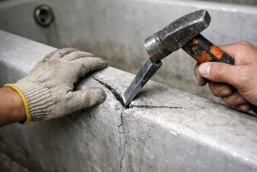Ini adalah rahasia agar tambalan awet. Jangan langsung menambal di atas retakan tipis. Gunakan pahat untuk sedikit memperlebar retakan membentuk huruf “V” atau “U” sedalam 2-3 cm. Tujuannya agar OYU-FASTPLUG bisa masuk dan mencengkeram kuat ke dalam struktur beton. Setelah itu, sikat bersih area tersebut dari lumut dan sisa puing.